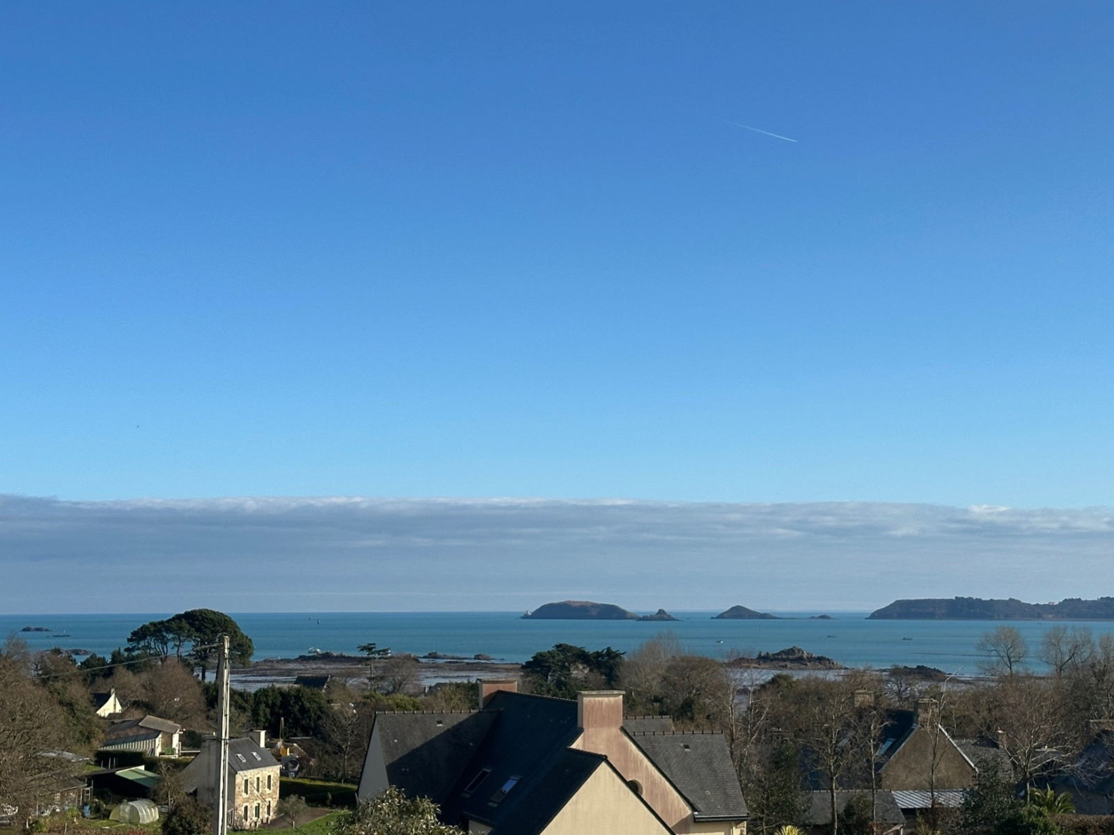 À l’étage, deux chambres avec dressing dont, une donnant sur une vaste terrasse privative, un espace de vie avec une vue exceptionnelle sur la baie de Paimpol, une salle de bain et un WC.